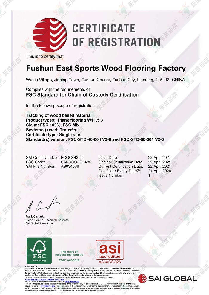 “東體運動”木地板系列產品已經通過國際籃聯檢測、世界羽聯認證、歐盟體育地板專項標準CE認證、歐盟環保產品CE認證、FSC世界森林協會認證、五星級售后服務企業認證等,是中國職業籃球俱樂部遼寧沈陽三生飛豹籃球俱樂部官方合作伙伴,內蒙古籃球協會戰略合作伙伴。